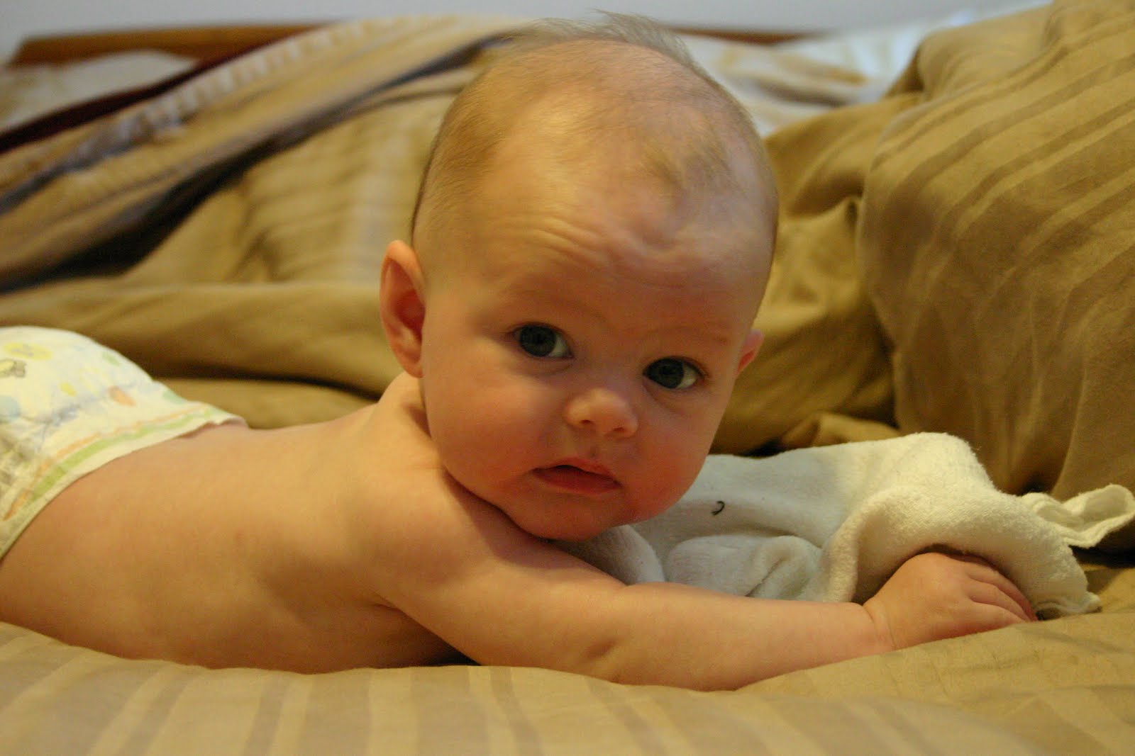 Owen is very grabby and loves to reach out and grab hair, glasses, shirts, faces, eyes, noses, necks, or whatever he can get his hands on. Sometimes it's pretty painful when he gets a good hold on you and squeezes with his little fingers and nails.